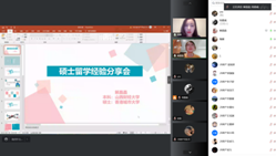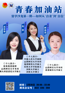 依托学院团委“青春加油站”品牌活动,于5月28日、29日通过线上形式举办了留学沙龙。本次沙龙邀请了在悉尼大学获得硕士学位的吴思粤、在剑桥大学获得博士学位的陶媛、在香港城市大学获得硕士学位解晶晶、在布里斯托大学获得硕士学位的田欣悦和王晔、就读于西交利物浦大学硕士研究生孙柯6位校友进行留学经分享。学院青年教师和部分同学参加。