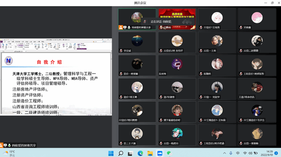 按照学校疫情防控和樱花动漫 新生入学教育总体安排,9月19日下午14:30,樱花动漫 工程造价专业2022级新生和教师相约腾讯会议云端,准时开启了2022级工程造价专业新生专业教育第一讲《工程造价专业教育-专业介绍及角色转变》。本次课程由二级教授、工程造价专业资深教师阎俊爱教授主讲,教研室主任白鹏锐主持。