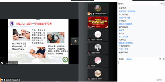 最后,阎俊爱老师以“大学生活是什么样”的话题开启了本次课程的第三个主讲内容“高中到大学角色的成功转变”。阎老师以专业导师和大学师友的角色带着2022级新生线上畅游了财大校园,从修德到立信、从博学到求真,在欣赏学校标志建筑物的同时,让新生秉记学校校训“修德立信,博学求真”;从教室到食堂、从图书馆到体育场,在领略学习和生活的同时,让新生畅想即将开始的美好大学生涯。进一步,从学习方式、教学方式、学术标准以及学科学生等四方面对比了大学与中学的不同之处,就如何成功转变给新生提出了八点建议、分享了三个定律:建议减少未知、认可自己的感觉并花时间改变、利用学校资源、学习高等教育的语言、到教室上课、管理课余时间、掌握大学学习方法、成为一个自律的学习者;鸭子定律、螃蟹定律、金蝉定律。