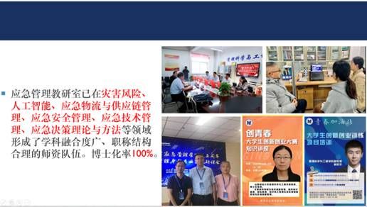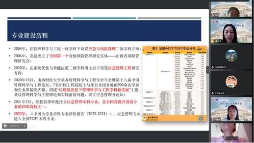 2022年9月20日下午,应急管理专业在云端举办新生导师见面会,应急管理教研室全体教师参加会议,会议由应急管理教研室主任王迪主持。会议第一阶段,王迪老师对樱花动漫 应急管理专业建设历程重要节点进行介绍。2021年3月,经教育部审批,山西财经大学设立应急管理本科专业,成为全国首批开设该专业的20所高校之一;2022年,根据《中国大学及学科专业评价报告(2022-2023)》,山西财经大学应急管理专业进入全国TOP1本科专业。专业紧密围绕习近平总书记提出的国家安全观的顶层要求,通过合理的课程体系设计,旨在培养拥有高度社会责任感、具备国际视野、创新精神、德智体美劳全面综合发展的高素质应急管理人才。会议第二阶段,由应急管理教研室副主任闫慧丽老师介绍教研室师资力量,应急管理教研室师资力量雄厚,现有教授3人,副教授4人,讲师3人,博士化率100%,已在灾害风险、人工智能、应急物流与供应链管理、应急安全管理、应急技术管理、应急决策理论与方法等领域形成了学科融合度广、职称结构合理的师资队伍,能够有力支撑“本-硕-博”完整的应急管理人才培养体系。同时,在人才培养过程中,专业突出理论教学、实践训练和应急管理规划与设计相融合,在开展应急管理理论教学与科学研究的同时,为学生提供创新创业、学科竞赛指导,以及应急管理大讲堂特色活动,搭建“学科竞赛+科研项目+应急演练”三位一体的个性化育人平台。