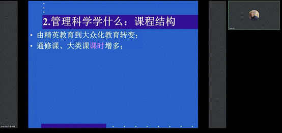 922日上午,2022级管理科学专业新生第四次专业教育课准时上线,课程内容为《管理科学专业人才培养方案解读》,本次课程是由管理科学教研室徐燕副教授主讲。徐老师详细地介绍了2022年新版管理科学专业本科人才培养方案,内容包括了培养目标、培养规格、学制与学位基本修业年限、毕业及授予学位要求、课程体系及教学计划、实践育人环节等,使同学们更加深入地了解管理科学专业的未来就业前景与就业方向。