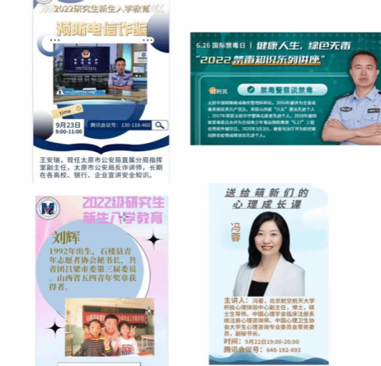 打磨通识教育总体方案。学院党委书记通过开学“第一课”《积极开展党建双创,传承立德树人使命》,结合学院全国党建工作标杆院系培育创建理念,引导学生坚定理想信念,练就过硬本领,投身报国伟业。学院院长结合学校、学院校史院情,号召研究生新生爱校荣校、树立远大理想,努力实现从“学校为我做了什么”到“我能为学校做什么”的转变;学院团委书记结合研究生学籍管理及生涯规划,学习了研究生管理手册,引导新生从现在开始规划好自己的研究生活,不负韶华。北京航空航天大学心理咨询中心冯蓉副教授为新生进行心理健康教育,鼓励学生塑造阳光心态 成就更好自己。太原市强制隔离戒毒所管理科长刘利民警官和太原市公安局直属分局指挥室副主任王安瑞警官结合详实的工作案例,分别从禁毒知识和预防电信诈骗为大家上了一堂安全教育课,呼吁大家谨防诈骗、远离毒品,共同为营造和谐平安的校园环境贡献力量。山西省五四青年奖章获得者刘辉结合自己多年的志愿服务经历,号召大家都参与到奉献友爱的志愿服务中。就职于中国烟草的郭彦凯、国家税务总局的任文瑾、阳城县西河乡党办的初雯昕、之江实验室的赵泳琪和在华北电力读博的杨坤,5位杰出校友分别结合自身经历从读博、人才引进、考公、民企等为大家传授经验。9月24日下午的,班级主题班会“青春与科研相伴、成长与挚友同行”,辅导员与大家一同学习了《高校新冠肺炎疫情防控技术方案(第六版)》具体内容。97名同学精心准备了自我介绍与研究生规划,增进了班级凝聚力。