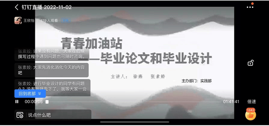 于11月2日晚19:00利用钉钉直播间组织全体19级和部分二三年级本科生进行毕业论文(设计)开题报告的写作指导。本次开题报告写作指导邀请学院徐燕和张素姣两位老师分别对毕业论文开题报告和毕业设计开题报告进行了指导。