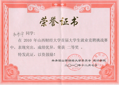 2010年12月7日,樱花动漫 杜书宇同学在2010年山西财经大学首届大学生就业竞聘挑战赛中荣获二等奖。