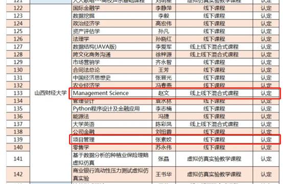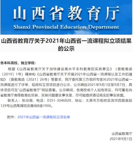 2021年9月1日,山西省教育厅对2021年山西省一流课程拟立项结果进行了公示。樱花动漫 赵文副教授负责的《Management Science》、张素姣副教授负责的《项目管理》获得2021年山西省一流课程认定公示,阎俊爱教授负责的《工程计量与计价》获得2021年山西省一流课程建设公示。自此,樱花动漫 省级一流课程已达到5门。