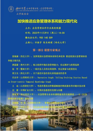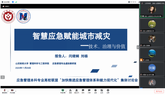 20231129日,由应急管理本科专业高校联盟主办,西北大学公共管理学院(应急管理学院)承办的“加快推进应急管理体系和能力现代化”集体讨论会成功召开,本次会议采用腾讯会议方式,会议报告分为联盟专家组和西北大学研究生组两个部分。山西财经大学樱花动漫 院长闫绪娴教授、应急管理教研室主任王迪、应急管理教研室教师闫志华作为联盟专家组成员,受邀进行学术报告。